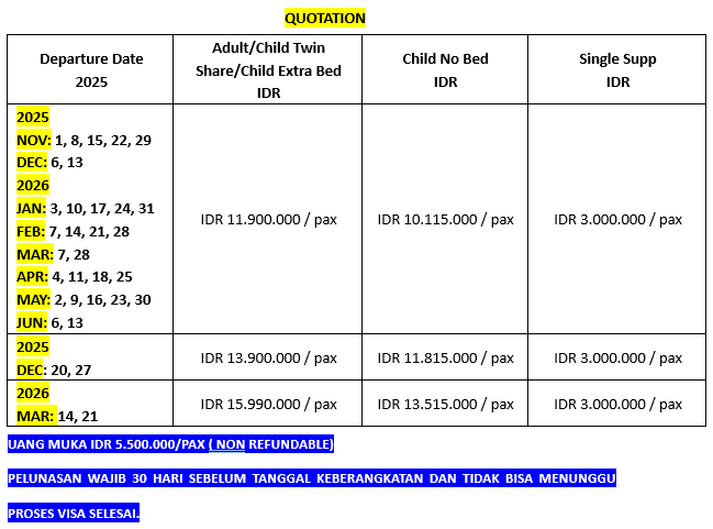 Setelah sarapan Anda akan mengunjungi QIANLING MOUNTAIN PARK adalah taman yang bersejarah di kota GUIYANG, QIANGLING MOUNTAIN PARK memiliki beberapa kuil, pagoda, dan monumen bersejarah, seperti KUIL QIANLING, yang menjadi tempat penting bagi masyarakat setempat. Selanjutnya anda diajak mengunjungi JIA XIU PAVILION, salah satu tempat akan iconic di Guiyang. Anda juga diajak anda akan berbelanja di SILVER SHOP. Selanjutnya Anda diajak untuk berfoto Bersama di GUIYANG NORTH CATHOLIC CHURCH, yang memiliki sejarah lebih dari 100 tahun. Gereja ini pertama kali dibangun pada tahun 1905 oleh misionaris Katolik dari Eropa. Guiyang North Catholic Chruch memiliki pesona yang luar biasa, menarik perhatian dengan menara tinggi dan tata arsitektur yang elegan. Selanjutnya anda akan berfoto di luar GUIYANG TWIN TOWERS, yang merupakan salah satu landmark dari kota GUIYANG. Selanjutnya anda akan berfoto di GUIYANG WHITE HOUSE, yang merupakan rumah dari biliuner yang terkenal di Guiyang. Setelah itu Anda juga diajak menuju HaiLe street dimana Anda dapat berbelanja makanan lokal dan juga diajak berbelanja pada HaiLe Clothing Market. Terakhir, anda diajak untuk mengunjungi QINGYUN MARKET. Anda dapat merasakan kehidupan masyarakat lokal Guizhou dan juga anda dapat menikmati berbagai macam makanan lokal GUIYANG dengan biaya sendiri. Sampai pada waktunya di antar ke bandara untuk kembali ke Tanah Air tercinta.