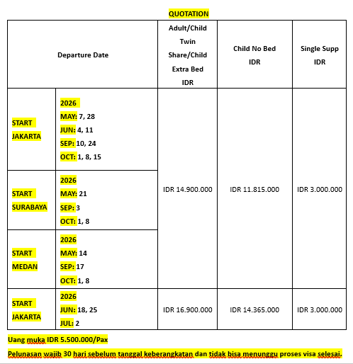 Tiba di Jakarta / Surabaya / Medan. Terima kasih atas partisipasi Anda dalam tour ini. Sampai jumpa di acara tour berikutnya