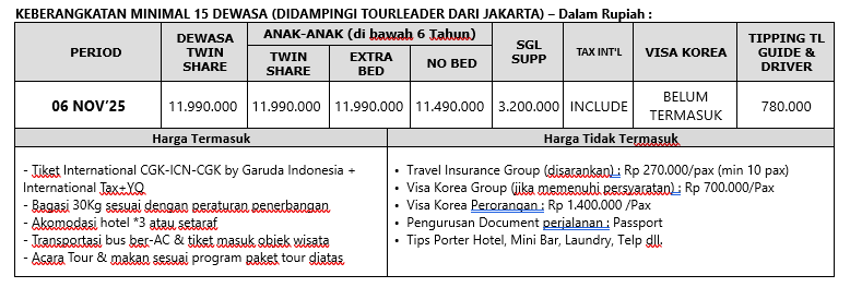 • Visa Korea Group (jika memenuhi persyaratan) : Rp 700.000/Pax