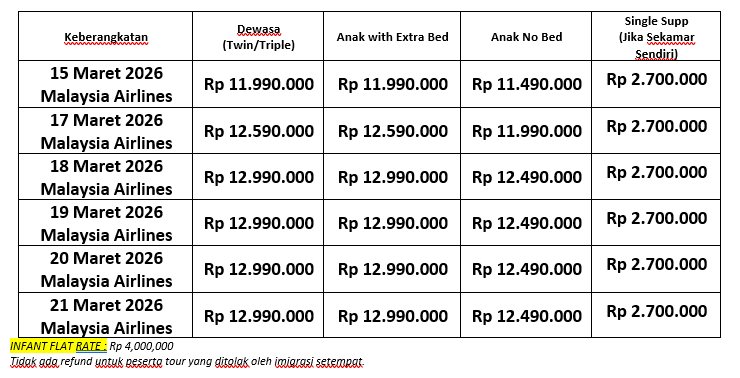 - Bagi peserta tour yang berusia diatas 69 tahun, wajib membayarkan extra premi untuk asuransi perjalanan yang sudah termasuk.