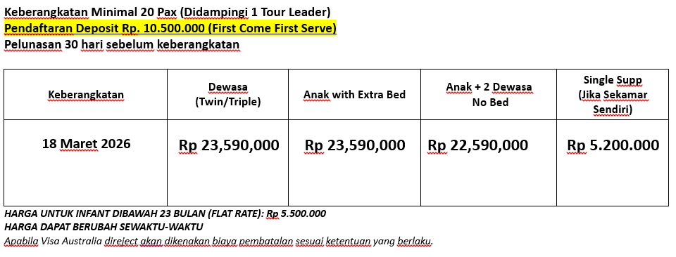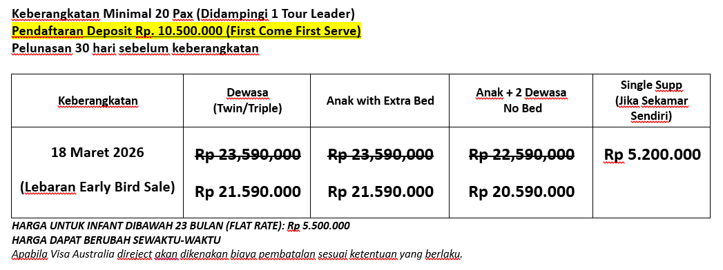 Sarapan pagi dengan Box Meal, Kita Check-out Hotel dan menuju Airport untuk penerbangan menuju Kota Melbourne. Setibanya di Melbourne, kita menuju Parliament House Melbourne (Photostop), St. Patrick Cathedral (Photostop), Royal Botanic Garden, sebuah kebun botani yang terbagi di dua lokasi—Melbourne dan Cranbourne. Kebun Melbourne didirikan pada tahun 1846 ketika sebidang tanah di sisi selatan Sungai Yarra disisihkan untuk kebun botani baru. Kebun ini membentang seluas 38 hektare, menurun ke arah sungai, dan dipenuhi dengan pepohonan, hamparan taman, danau, serta hamparan rumput.. Sore hari kita menuju Shrine of Remembrance,(Photostop) sebuah monument pahlawan dengan gaya arsitektur Yunani dan digunakan untuk memperingati dan menghormati para pahlawan yang gugur di Perang Dunia I, tapi sekarang digunakan untuk mengenang pahlawan di semua medan perang yang pernah ada. Setelah itu kita menuju National Gallery Victoria yang populer dengan sebutan NGV, adalah museum seni yang terletak di Melbourne, Victoria, Australia. Didirikan pada tahun 1861, museum ini merupakan museum seni tertua dan paling banyak dikunjungi di Australia. Dengan lebih dari 76.000 karya dalam koleksinya, NGV memiliki koleksi terbesar dibandingkan galeri manapun di Australia.. Check-in hotel dan istirahat