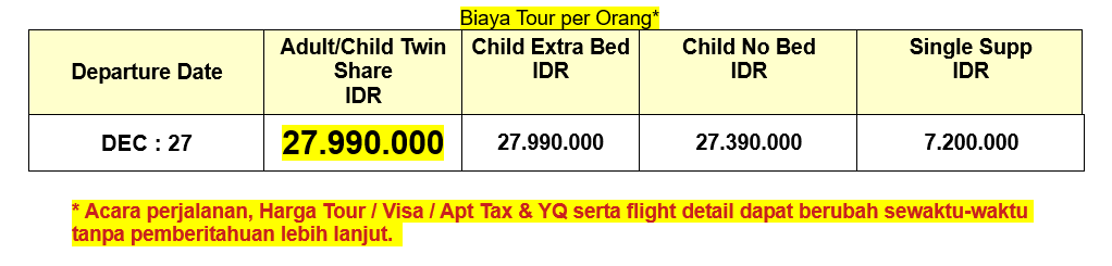 * Karena keterbatasan hotel & flight, susunan acara dapat berubah disesuaikan dengan hotel dan flight yg confirmed.