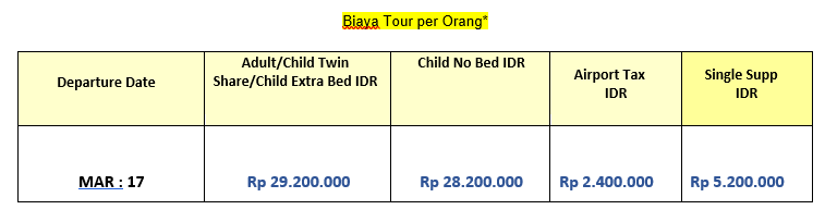 Dengan membayar uang tanda jadi / uang muka pendaftaran Biaya Tour, Anda dianggap telah memahami dan menerima syarat & kondisi di atas. Syarat & Kondisi Tour selengkapnya berlaku sesuai dengan yang tertera di dalam brosur program tour / website.