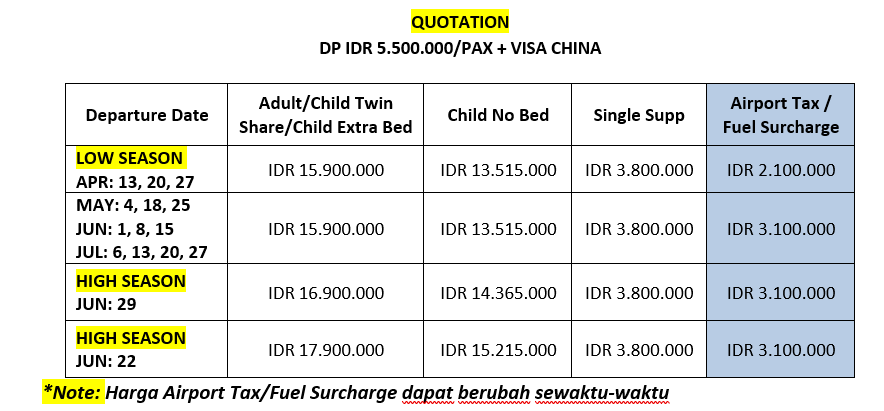 · Wajib menggunakan Visa Group, apabila tidak akan dikenakan biaya tambahan sebesar IDR 580.000 / pax (belum termasuk PPN 1,1persen)