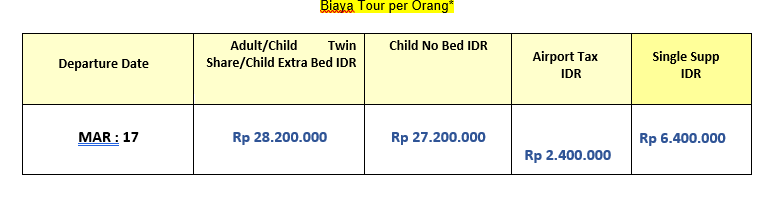 Dengan membayar uang tanda jadi / uang muka pendaftaran Biaya Tour, Anda dianggap telah memahami dan menerima syarat & kondisi di atas. Syarat & Kondisi Tour selengkapnya berlaku sesuai dengan yang tertera di dalam brosur program tour / website.