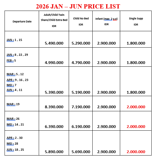 Dengan membayar uang muka atau full payment pada saat pendaftaran Biaya Tour, Anda dianggap telah memahami dan menerima syarat & kondisi di atas. Syarat & Kondisi Tour selengkapnya berlaku sesuai dengan yang tertera di dalam brosur program tour / website.