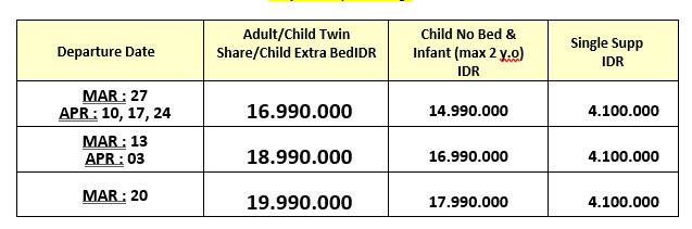 Dengan membayar uang tanda jadi / uang muka pendaftaran Biaya Tour, Anda dianggap telah memahami dan menerima syarat & kondisi di atas. Syarat & Kondisi Tour selengkapnya berlaku sesuai dengan yang tertera di dalam brosur program tour / website.