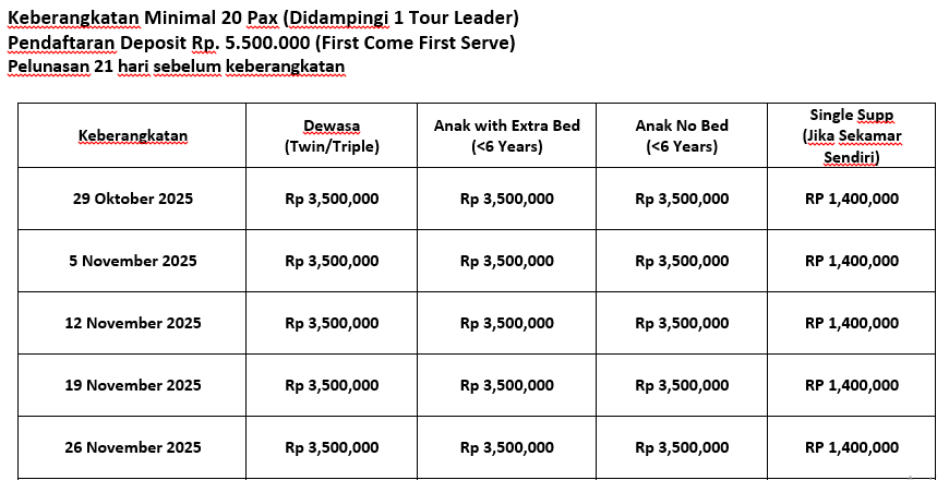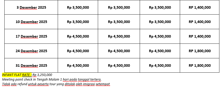 - Bagi peserta tour yang berusia diatas 69 tahun, wajib membayarkan extra premi untuk asuransi perjalanan yang sudah termasuk.