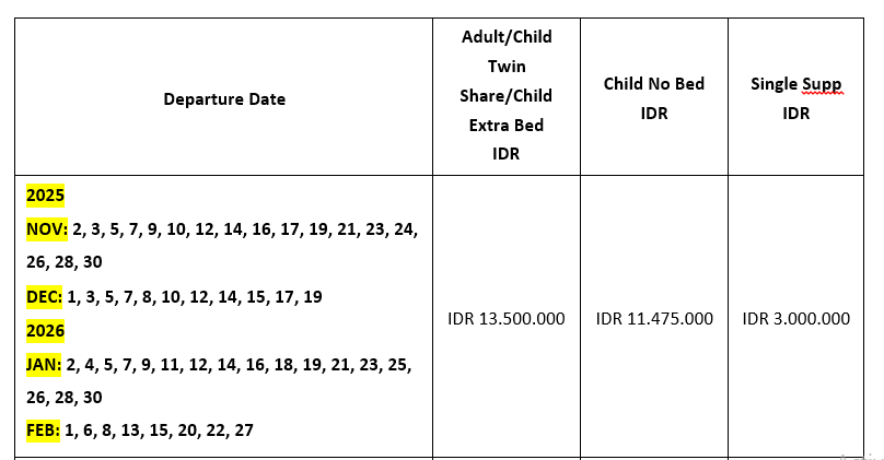 Setelah sarapan, Anda akan diantar ke bandara untuk kembali ke Jakarta. Terima kasih atas partisipasi Anda dalam tour ini. Sampai jumpa di acara tour berikutnya.