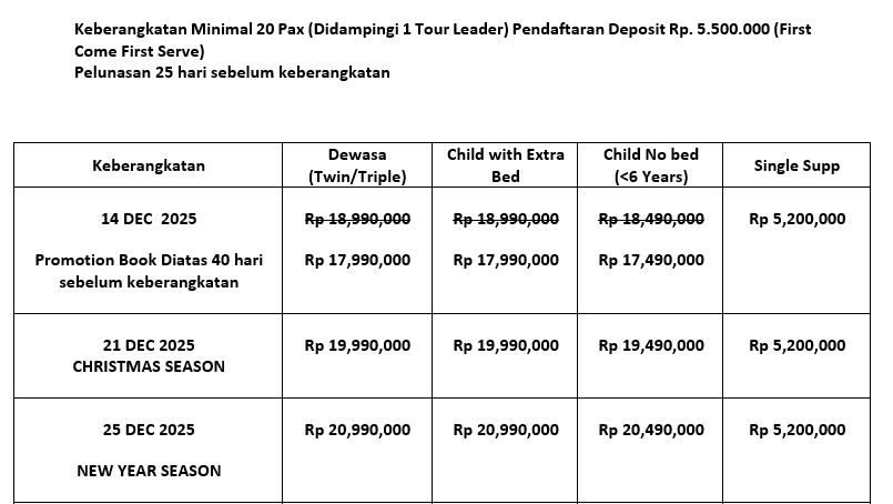 Sarapan pagi di hotel, Hari ini kita akan kembali ke tanah air tercinta. Berakhirlah tour yang berkesan ini dan sampai jumpa di tour selanjutnya bersama kami.