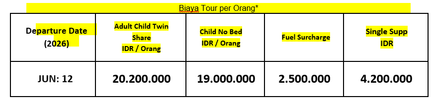 Note : Waktu dan tempat dalam itinerary disesuaikan dengan kondisi yang akan ditentukan Tour Leader & Guide tanpa mengurangi tempat yang akan dikunjungi