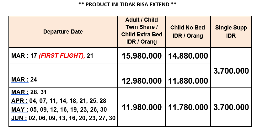 Kumpul di bandara 15.50 untuk bertemu dengan tour leader Anda. Penerbangan menuju ke
