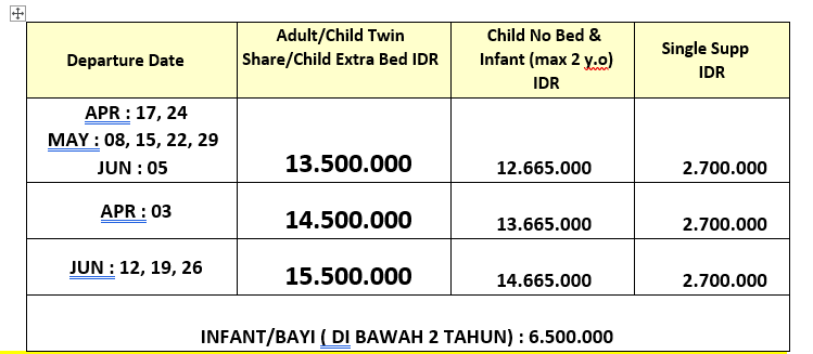 Note : Waktu dan tempat dalam itinerary disesuaikan dengan kondisi yang akan ditentukan Tour Leader&Guide tanpa mengurangi tempat yang akan dikunjungi