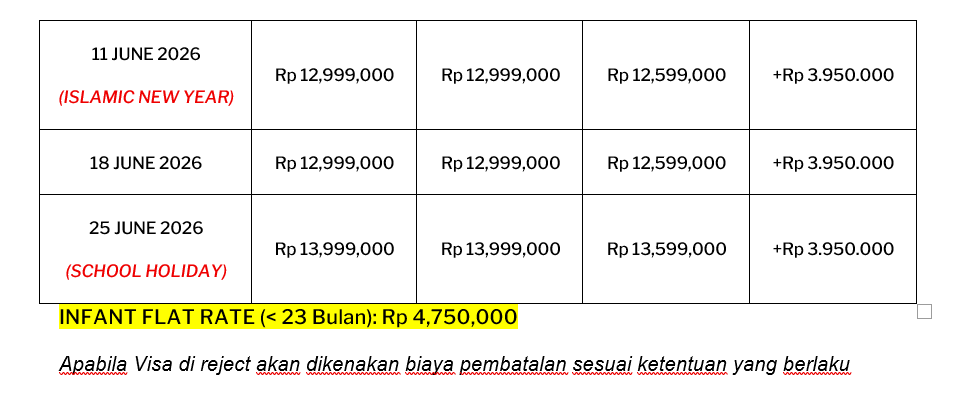 Peserta yang telah menyatakan konfirmasi keikutsertaan wajib melakukan pembayaran uang muka (Down Payment/DP) sesuai nominal yang ditetapkan pada masing-masing series serta melampirkan salinan paspor yang masih berlaku minimal 6 (enam) bulan sejak tanggal kepulangan. Apabila terdapat penambahan atau revisi nama pada halaman 4–5 paspor, wajib dilampirkan pula.