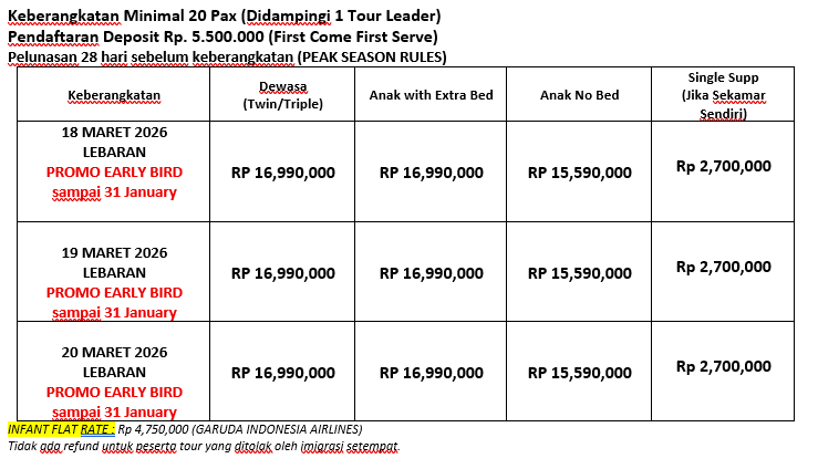Jika tamu fix confirm untuk join tour mohon bantuan rekan travel agent untuk push DP sesuai dengan deposit yang ditetapkan pada masing-masings series, dengan menyertakan copy paspor masing-masing peserta yang masih berlaku minimal 6 bulan dari waktu kepulangan. Apabila ada revisi/ penambahan nama di halaman 4 – 5 harap dilampirkan juga.Tamu yang booked dengan DP dan telah melakukan konfirmasi via email ke kami, maka kami akan memberikan konfirmasi tour.Tamu yang belum DP statusnya masih dapat tergeser kapan saja dengan tamu yang sudah DP. Ataupun tamu yang membayar DP kurang dari ketentuan yang berlaku, dapat digeser, tanpa adanya pengembalian deposit.