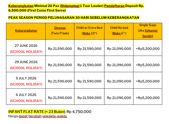 - Harga tour bersifat all-in (termasuk pajak internasional).