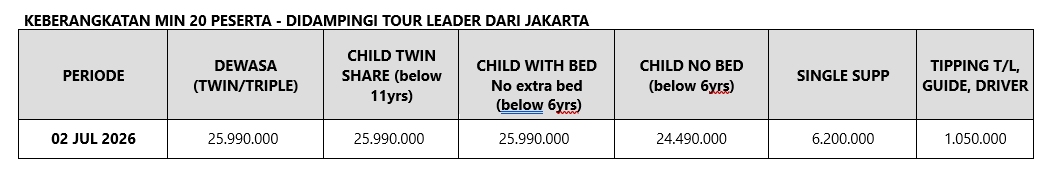 Jika terjadi Perubahan Sesuai Peraturan Pemerintah Mengenai Pandemi Virus Covid-19 (diharuskan karantina Test Antigen & PCR) Semua biaya ditanggung oleh Peserta Tour,Apabila Tamu Cancel dan Tidak mengikuti Sesuai Info maka (Deposit non-Refund)
