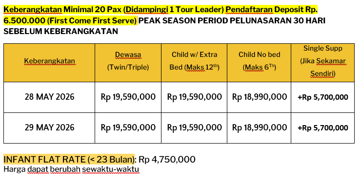 - Harga tour bersifat all-in (termasuk pajak internasional).