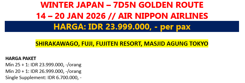 Kita akan check out pagi pagi untuk langsung ke Bandara dan Kembali ke Jakarta dengan Air Nippon Airlines, tiba di Jakarta, setelah proses bagasi selesai, maka selesai sudah kegiatan tour Winter Japan Golden Route, terima kasih dan sampai bertemu di tour selanjutnya.