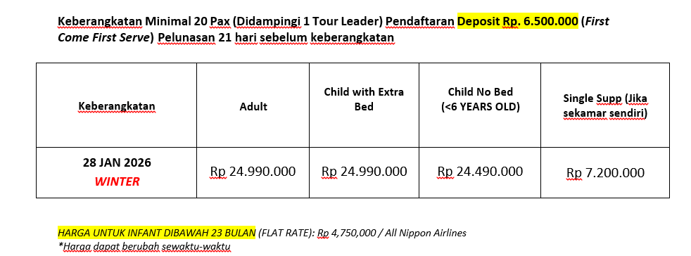 Setibanya di Bandara Chitose, Anda akan disambut oleh pemandu wisata yang ramah dan profesional. Perjalanan Anda pun dimulai dengan mengunjungi Salmon Park Road, sebuah pusat wisata dan kuliner yang mengangkat tema salmon sebagai daya tarik utama. Di sini, Anda bisa mencicipi berbagai hidangan khas serta mempelajari budaya lokal yang erat kaitannya dengan ikan salmon. Selanjutnya, Anda akan melanjutkan perjalanan menuju Jigokudani yang dikenal sebagai "Lembah Neraka", ikon utama wisata di Noboribetsu. Kawasan ini terkenal dengan aktivitas geotermalnya yang unik, semburan uap panas, dan lanskap dramatis yang menakjubkan. Perjalanan selanjutnya dengan kunjungan ke Silo Observatory, di mana Anda dapat menikmati panorama indah dan luasnya Danau T?ya, salah satu danau kaldera tercantik di Hokkaido.