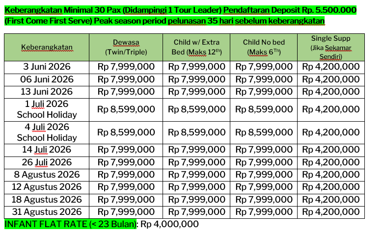 - Harga tour bersifat all-in (termasuk pajak internasional).