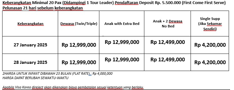 - Tour yang sudah di deposit, maka tarif dasar secara otomatis mengikat, tetapi Harga airport tax internasional/Tipping/Visa masih dapat berubah sewaktu-waktu tanpa pemberitahuan terlebih dahulu sesuai dengan kondisi yang berlaku(seperti kenaikan harga signifikan akibat kurs, kenaikan fuel surcharge, dll) dan sebelum keberangkatan atau tiket diissued(Untuk Tax internasional). Sebelum adanya deposit, harga basic tour dapat berubah-ubah sewaktu-waktu.