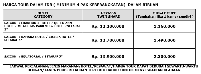 Check in di Bandara Soekarno untuk terbang menuju Saigon, Vietnam. Setibanya di saigon dijemput oleh local guide kami dan diantar ke Hotel untuk beristirahat. Acara bebas