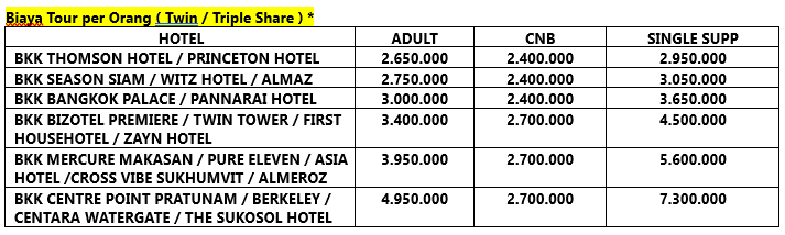 Setelah sarapan pagi Menuju Damnoen Saduak Floating Market include Boat Canal Tour (include Boat Canal Tour arround 45-60 minutes), Meaklong Railway Market, Makan Siang Restaurant Lokal, Kemudian menuju Erawadee Herb Shop, Icon Siam & Sook Siam Floating Market in the mall, Include Chaophraya Dinner Cruise, Kembali ke hotel.