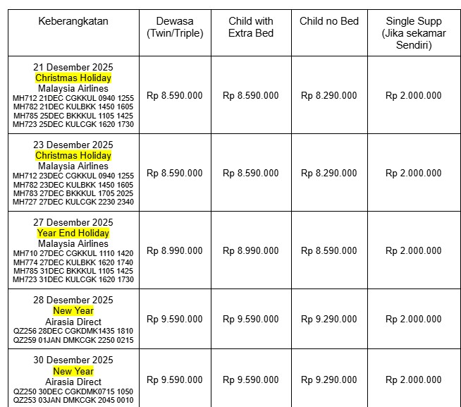 - Bagi peserta tour yang berusia diatas 69 tahun, wajib membayarkan extra premi untuk asuransi perjalanan yang sudah termasuk.