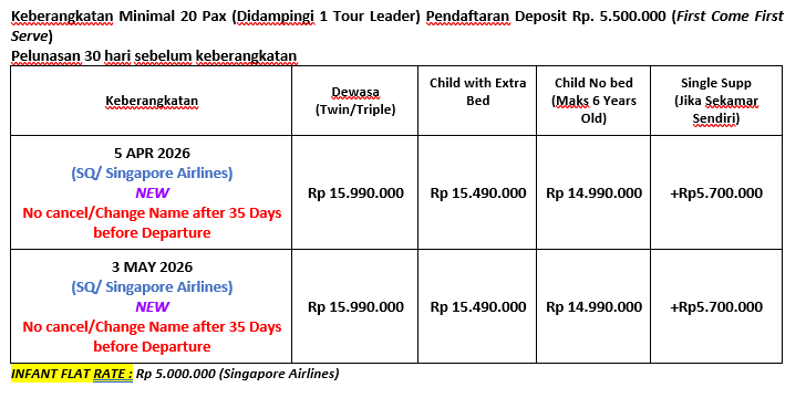 Paket tour Turki 10 hari ini mengajak Anda menjelajahi berbagai destinasi ikonik di Turkiye mulai dari Istanbul, Bursa, Kusadasi, Pamukkale hingga Cappadocia. Dalam perjalanan ini Anda akan menikmati pengalaman wisata budaya, sejarah, dan panorama alam yang sangat unik, termasuk pengalaman berlayar di Bosphorus Cruise yang terkenal. Program perjalanan menggunakan penerbangan Singapore Airlines dengan akomodasi hotel bintang 4 serta didampingi tour leader profesional.