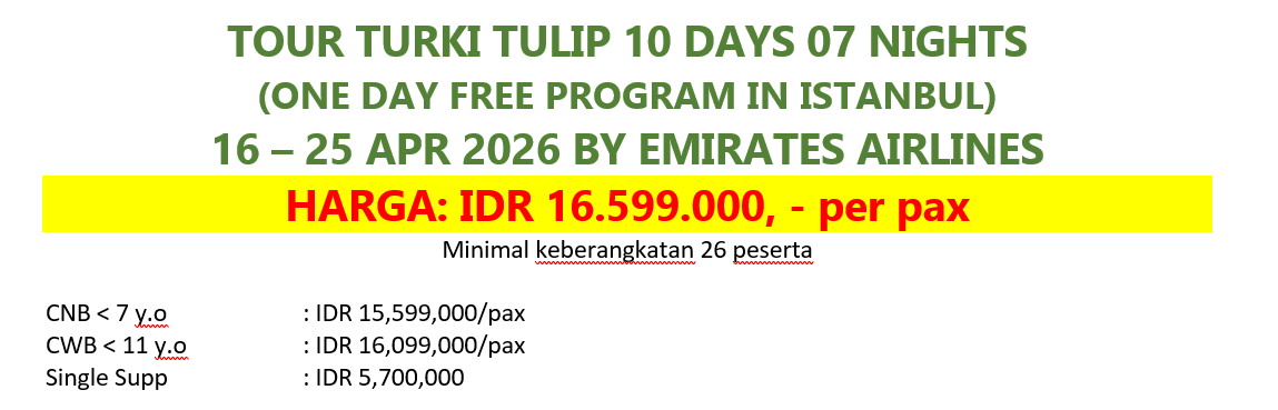 Setelah sarapan pagi dan check out hotel. Kita akan mengunjungi Emirgan Park untuk melihat keindahan bunga tulip. Menuju kota Tua Istanbul. Mengunjungi Blue Mosque dan Hippodrome. Berfoto di halaman depan istana Topkapi dan di depan Masjid Hagia Sophia. Makan siang di restoran. Lalu akan diantar menuju Airport, penerbangan menuju Dubai dengan EK 122 ETD 19.25