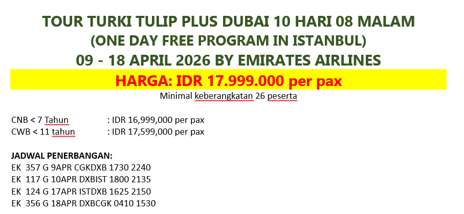 - Harga berlaku untuk periode perjalanan 09 – 18 April 2026