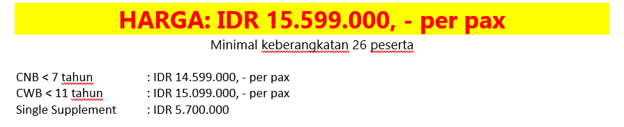 - Harga berlaku untuk 26 peserta. Apabila jumlah peserta kurang dari minimum kuota yang tersedia maka Kami berhak untuk melakukan penyesuaian harga atau pemindahan tanggal keberangkatan selanjutnya atau membatalkan keberangkkatan apabila tidak ada kesepakatan bersama.