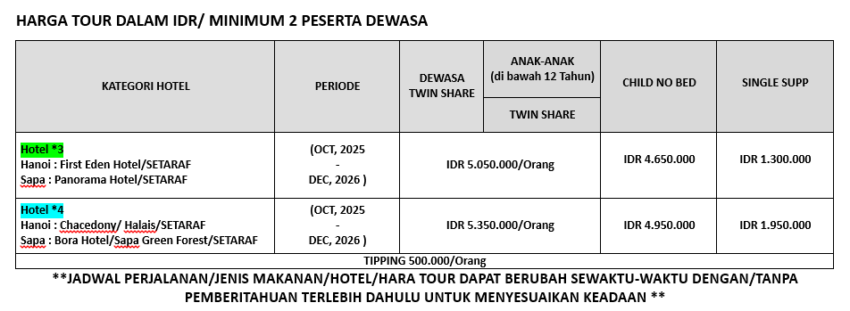 Tiba di Bandara Hanoi, Anda akan dijemput oleh perwakilan kami di vietnam dan diantar menuju hotel untuk check in. Setelah check in anda akan diantar untuk half day tour di kota Hanoi. Mengunjungi West lake, Pagoda tranc quoc, Hoan kiem lake, Joseph Cathedral, French opera house, Old Quarter, Train street. Makan malam di local resto |