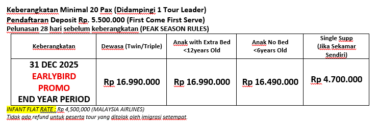 Sarapan Pagi. Waktu bebas sampai tiba waktunya diantar ke Airport untuk kembali ke Jakarta, Sampai jumpa di tour selanjutnya bersama kami.
