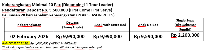 Sarapan pagi di hotel, hari ini kita akan menikmati kota Hanoi dengan mengunjungi St.Joseph Cathedral yang merupakan gereja tertua di Hanoi dengan arsitektur yang menawan, kita juga akan mengunjungi tempat berjesarah dan budaya seperti Ho Chi Minh’s House, His Mausoleum, Ba Dinh Square, One-Pillar Pagoda. Selanjutnya mengunjungi Buddhist Tran Quoc Pagoda on Westlake, kita juga berkesempatan menikmati suasana unik di Train Street di mana rel kereta melintasi jalan sempit yang dipenuhi kafe dan rumah penduduk sambil menikmati kopi kelapa atau cokelat panas khas Vietnam, sampai tiba waktunya diantar ke Airport untuk kembali ke Jakarta, Sampai jumpa di tour selanjutnya bersama kami.