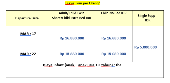 Dengan membayar uang tanda jadi / uang muka pendaftaran Biaya Tour, Anda dianggap telah memahami dan menerima syarat & kondisi di atas. Syarat & Kondisi Tour selengkapnya berlaku sesuai dengan yang tertera di dalam brosur program tour / website.