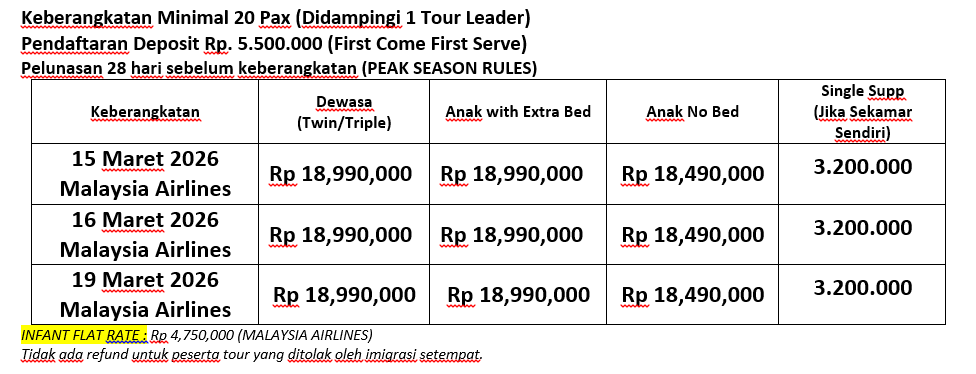 Sarapan pagi di hotel. Hari ini kita akan menikmati free time setelah waktunya tiba kita akan menuju ke airport untuk kembali menuju tanah air tercinta dan Berakhirlah tour yang berkesan ini dan sampai jumpa di tour selanjutnya bersama kami.
