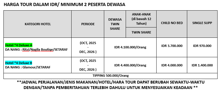 Sarapan pagi di hotel. Kita akan menuju Ba Na Hills. Tiba di Ba Na Hills, Anda akan merasakan pengalaman naik cable car modern yang memecahkan rekor dunia dan anda juga dapat menikmati pemandangan hutan dan air terjun. Setelah itu anda akan mengunjungi Le Jardin D’amor Flower Garden, Golden Bridge, Linh Ung Pagoda. Makan siang di local resto “French Village” Setelah makan siang, Anda akan melanjutkan eksplor French Square, Fantasy Park, Dan free time di area pantai. Mengunjungi Dragon Bridge, Love Bridge, Lalu Makan malam di local resto |