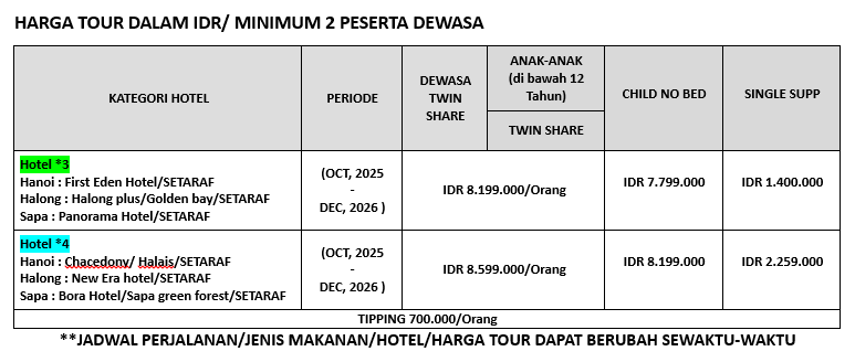 Sarapan pagi di hotel mengunjungi HONG LIEN SON MOUNTAIN dengan naik cable car Terpanjang di dunia sepanjang 6.292 meter. dengan ketinggian 2800 meter , Mengunjungi Pagoda dan Puncak dari Fansipan “The Roof of Indochina. Makan siang buffet di FANSIPAN Kembali ke sapa Check out hotel dan kembali menuju HA NOI Tiba di HA NOI Makan malam di local resto |