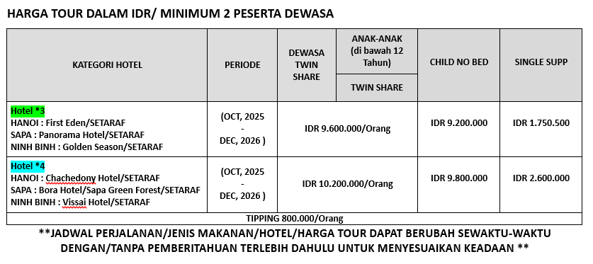 Sarapan pagi di hotel. Kita akan menuju Fansipan mountain. Tiba di Hoang Lien Son Station dan menuju Cable Car Station untuk menikmati keindahan Hoang Lien Son Mountain, Mengunjungi pagoda dan spiritual destinations lalu naik ke funicular untuk menuju The Roof Of Indochina (fansipan peak) Makan siang buffet di fansipan. Kembali menuju Sapa. Check Out Hotel dan Menuju ke Hanoi Tiba di Hanoi dan Makan malam di local resto |
