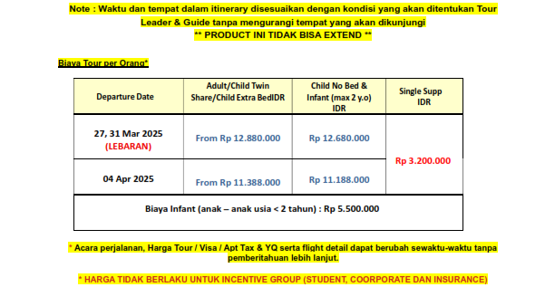 • Harga berdasarkan 25 Peserta Dewasa + 1 Tour Leader.