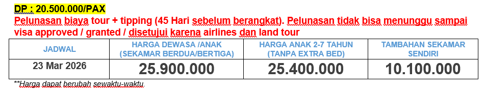 Jadwal dan Itinerary dapat berubah sewaktu tanpa pembentahuan terlebih dahulu kepada customer dan tergantung pada kebijakan pihak airlines, hotel dan partner agen di luar negeri. Segala kerugian yang terjadi baik materil teradapt customer tidak dapat dibebankan kepada pihak kami