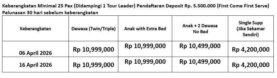 Pagi ini kita akan berangkat dari hotel menuju local supermarket terlebih dahulu untuk berbelanja terakhir sekaligus sarapan pagi, Setelah itu Tiba waktunya diantar ke Airport untuk kembali ke Jakarta. Berakhirlah tour yang berkesan ini dan sampai jumpa di tour selanjutnya bersama kami.
